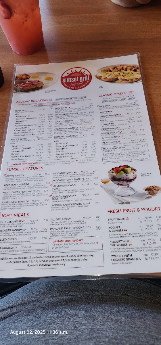 If you’re craving a classic omelette, their Classic Omelettes section has something for everyone. From the zesty Mexicana to the savory Western, the Great Canadian Greek, and the creamy Florentine, each dish is sure to hit the spot. For more adventurous eaters, the Sunset Features offer creative meals like the decadent Monte Cristo and the indulgent Breakfast Poutine. For a truly unique experience, try the Meat Lovers Poutine or the spicy Southwest Hash, and don’t forget to top it off with the refreshing Avocado Toast.